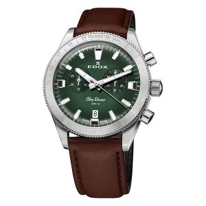 مدلهای جدید Edox Skydiver Chronograph یک نسخه محدود از 1000 قطعه در سراسر جهان هستند. قاب با قطر 40 میلی متر از فولاد ضد زنگ 316 لیتری با دوام استثنایی ساخته شده است که با مقاومت در برابر آب تا عمق 300 متر مشخص شده است. این عمامه عظیم نشان واحد چترباز را بر روی خود دارد. صفحه سبز با یک پنجره تاریخ در ساعت 6 و دو عدد فرعی کرنوگراف توسط یک کریستال یاقوت کبود گنبدی محافظت می شود که توسط یک قاب فولادی با مقیاس تله متریک احاطه شده است. Super-Luminova روی دست ها و شاخص ها به اطمینان از خوانایی عالی در نور کم یا اعماق دریا کمک می کند. قلب ساعت، حرکت کوارتز Edox 101 است. دستبند استیل با بند پروانه ای بسته می شود. به جای جعبه کلاسیک، ساعت در یک کیف مسافرتی چرمی با آرم Edox عرضه می شود. این پکیج ویژه شامل یک بند چرمی قهوه ایی نیز می باشد که به زیبایی با رنگ صفحه هماهنگ می شود. یک ساعت نظامی آماده برای رویارویی با هر ماجراجویی.