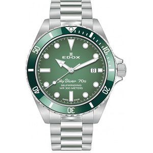 مدلهای جدید Edox Skydiver Chronograph یک نسخه محدود از 1000 قطعه در سراسر جهان هستند. قاب با قطر 40 میلی متر از فولاد ضد زنگ 316 لیتری با دوام استثنایی ساخته شده است که با مقاومت در برابر آب تا عمق 300 متر مشخص شده است. این عمامه عظیم نشان واحد چترباز را بر روی خود دارد. صفحه سبز با یک پنجره تاریخ در ساعت 6 و دو عدد فرعی کرنوگراف توسط یک کریستال یاقوت کبود گنبدی محافظت می شود که توسط یک قاب فولادی با مقیاس تله متریک احاطه شده است. Super-Luminova روی دست ها و شاخص ها به اطمینان از خوانایی عالی در نور کم یا اعماق دریا کمک می کند. قلب ساعت، حرکت کوارتز Edox 101 است. دستبند استیل با بند پروانه ای بسته می شود. به جای جعبه کلاسیک، ساعت در یک کیف مسافرتی چرمی با آرم Edox عرضه می شود. این پکیج ویژه شامل یک بند چرمی قهوه ایی نیز می باشد که به زیبایی با رنگ صفحه هماهنگ می شود. یک ساعت نظامی آماده برای رویارویی با هر ماجراجویی.