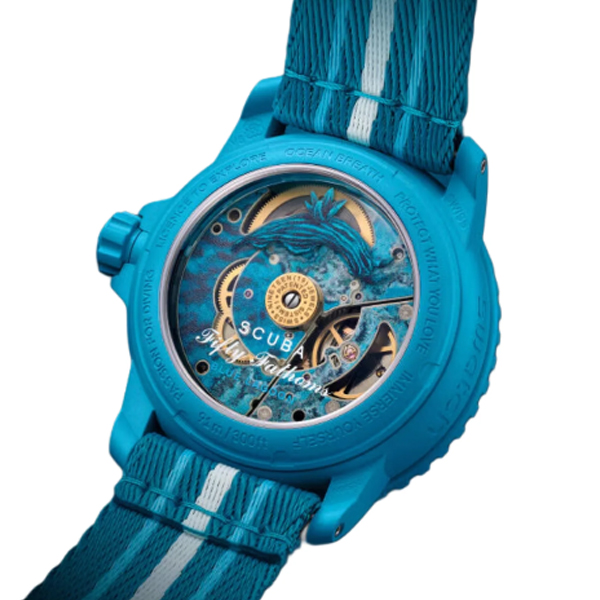 پنج کتیبه الهام بخش را میتوان در پشت ساعت یافت: اشتیاق برای غواصی، مجوز برای جستجو، تنفس اقیانوس، از آنچه دوست دارید محافظت کنید و در خود غوطه ور شوید.