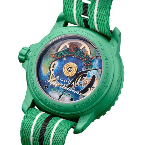 پنج کتیبه الهام بخش را میتوان در پشت ساعت یافت: اشتیاق برای غواصی، مجوز برای جستجو، تنفس اقیانوس، از آنچه دوست دارید محافظت کنید و در خود غوطه ور شوید.