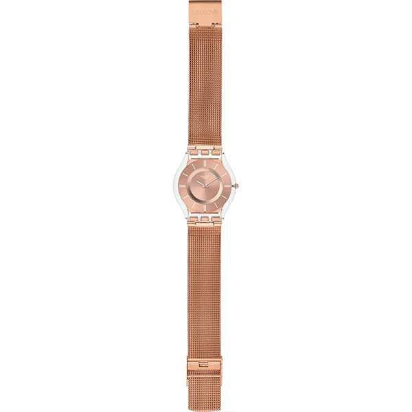 این ساعت فوقالعاده نازک دارای صفحهای به رنگ رزگلد با روکش آفتابخورده و اندیسهای سفید و عقربههای ساعتشمار و دقیقهشمار نقرهای است. قاب شفاف و براق آن از جنس مواد زیستی ساخته شده و روی آن شیشهی زیستی قرار گرفته است. بند توری قابل تنظیم آن از جنس استیل ضد زنگ است و دارای روکش PVD رزگلد زیبا میباشد.